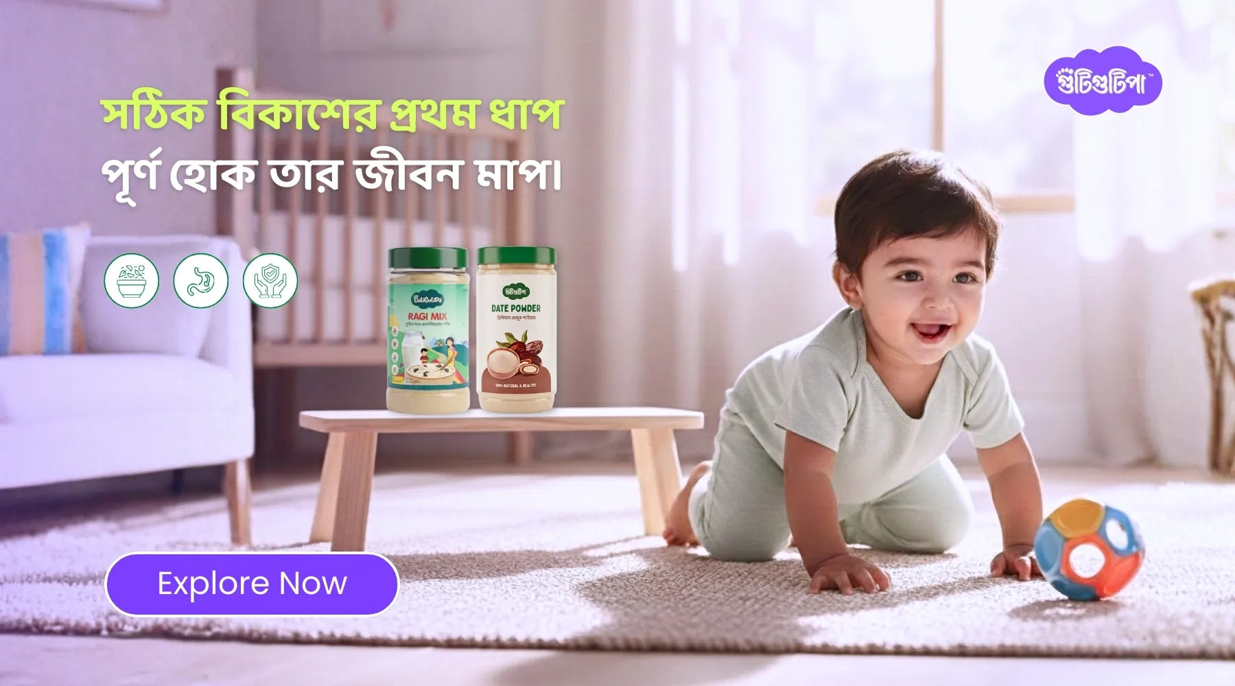 শুধু খাবার নয়, এ যে আপনার শিশুর সুস্থ ভবিষ্যতের ভিত্তি! গুটিগুটিপা-এর প্রতিটি খাবারের ফর্মূলা তৈরি হয়েছে শিশুর সঠিক ও সামগ্রিক বিকাশকে মাথায় রেখে—সেটি মস্তিষ্কের পুষ্টি হোক, বা শারীরিক বৃদ্ধি।